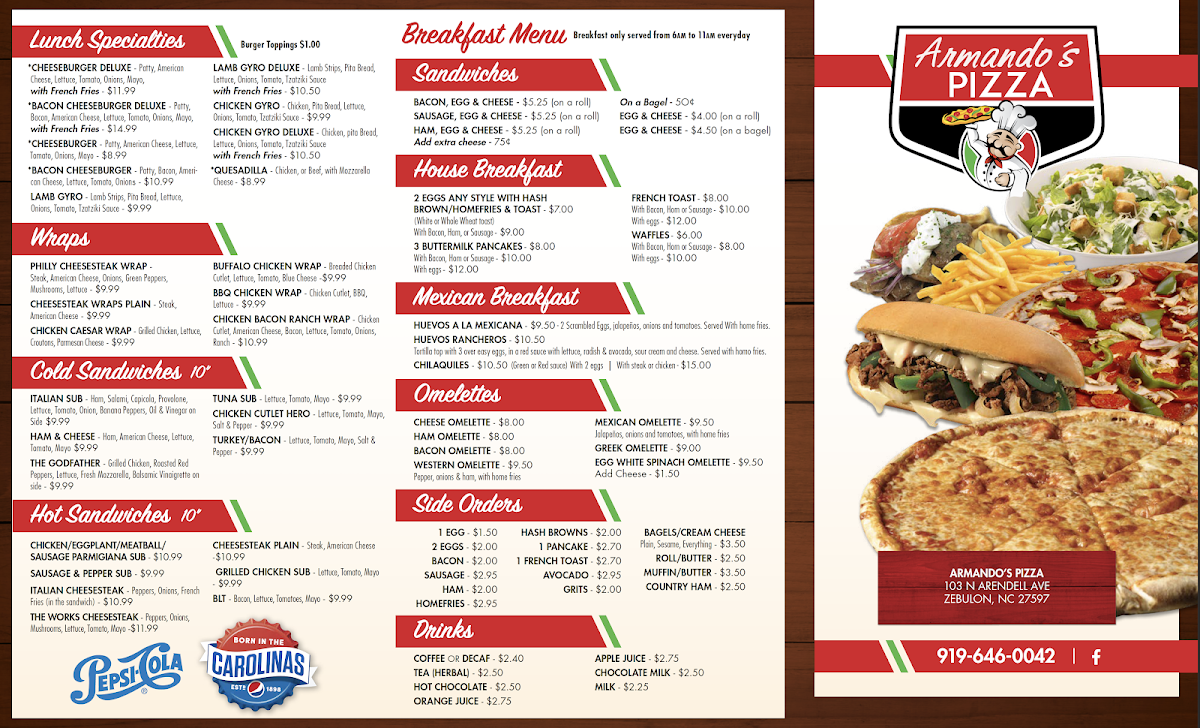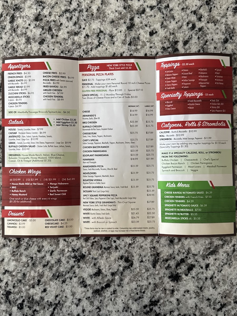 Overall, Armando’s Pizza Zebulon provides a well-rounded menu with something for everyone. Whether you're in the mood for a light salad, a hearty sandwich, or a tasty pizza, this spot delivers flavorful meals at great value.