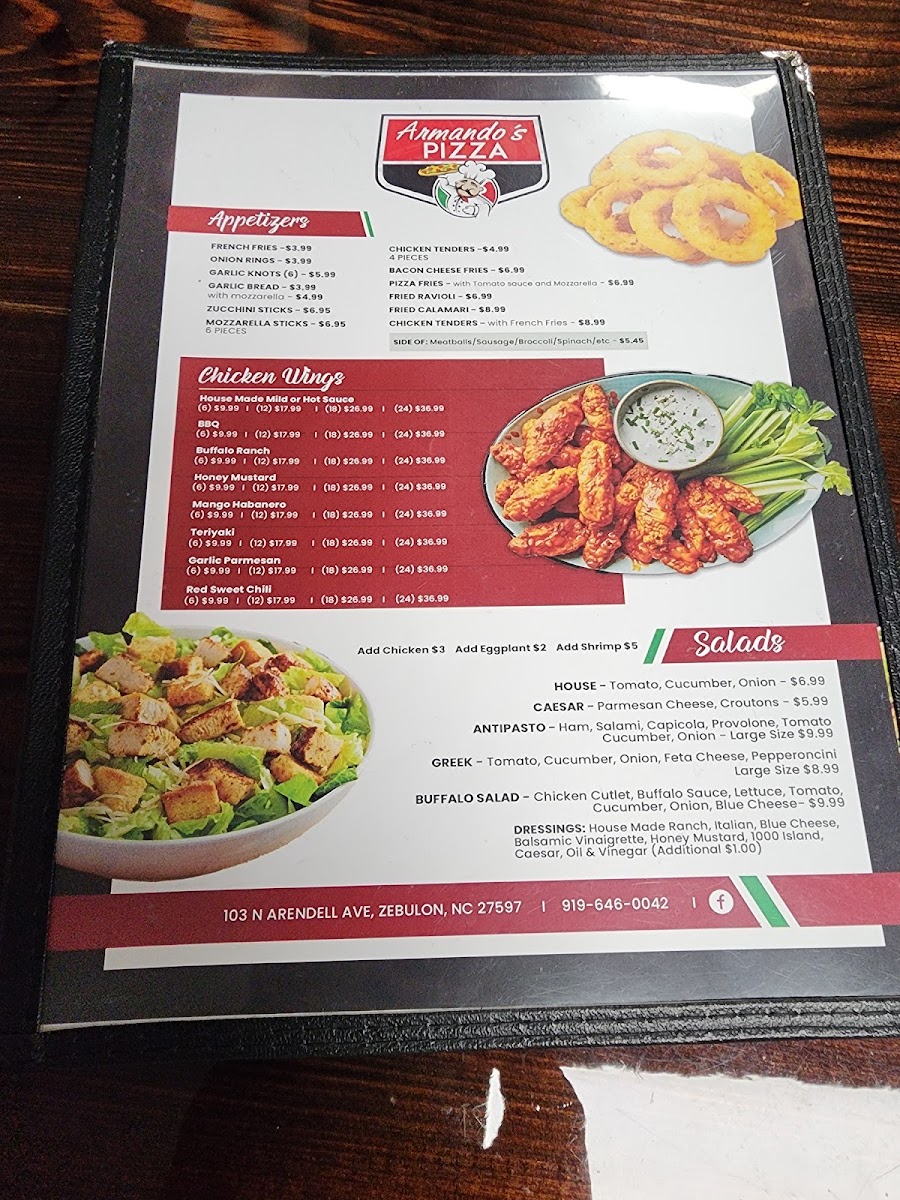 Armando’s Pizza Zebulon offers a delightful variety of dishes that cater to all tastes, making it a great place for a casual meal. Starting with appetizers, their French Fries and Onion Rings are classic choices, perfect for those looking for something crispy to begin their meal. If you’re in the mood for something lighter, the House Salad and House Salad with Chicken are fresh, crisp options that add a nice balance to the menu.
